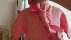Kimono-sleeved boxy dress with bow front and two slouch pockets.